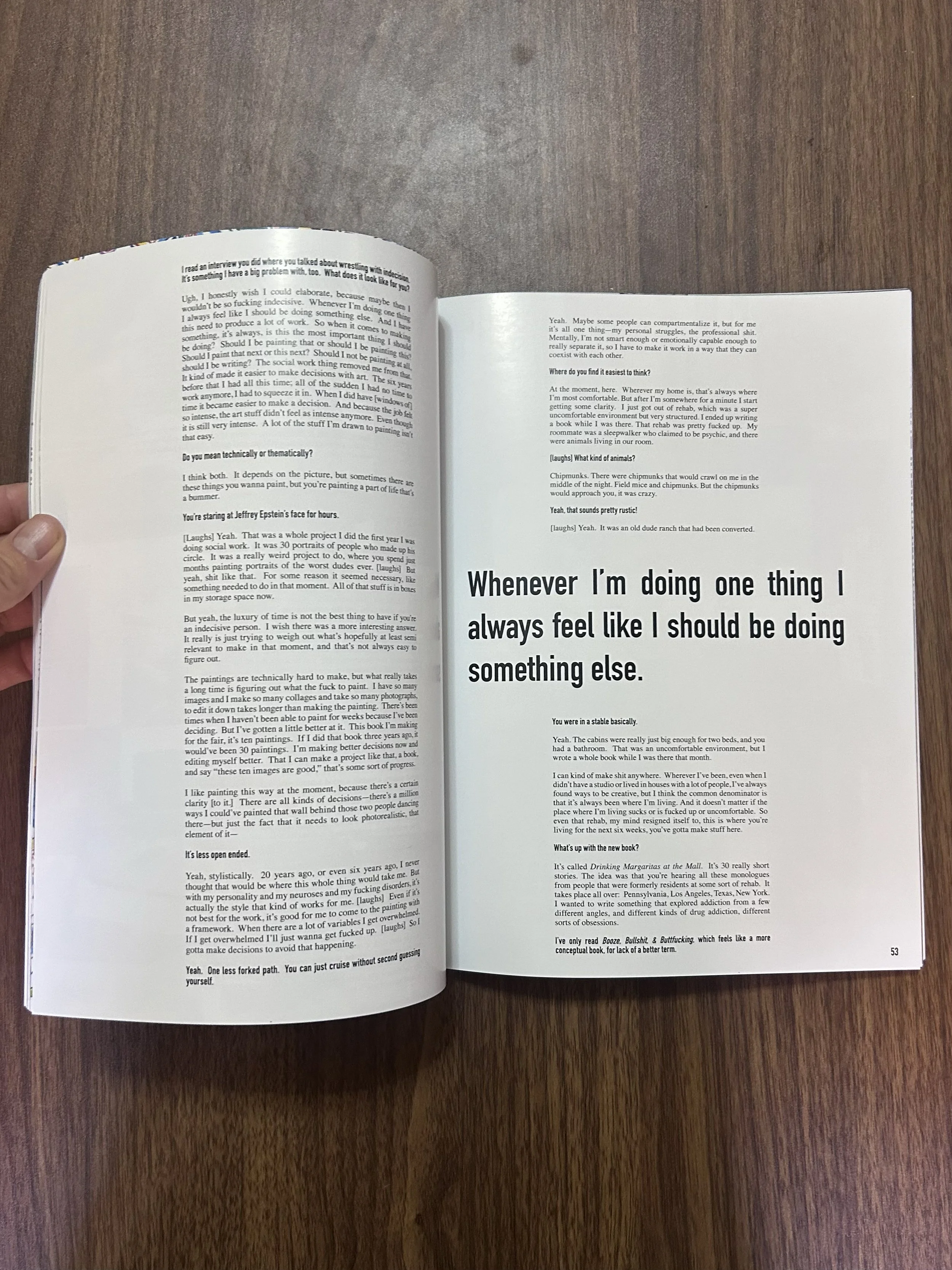 Discussed: borders, raves, addicition, algorithms, prank calls, painting, prophecy, rap, games, Zapatismo, Ohio, vulgarity, camoflauge, branding, Second Life, Clipse, Bananafish, Salinger, Letterman, Steve Miller Band, Alex Trebek, Non Worldwide, magazines, maps, magnesium, urgency, loitering, etc.